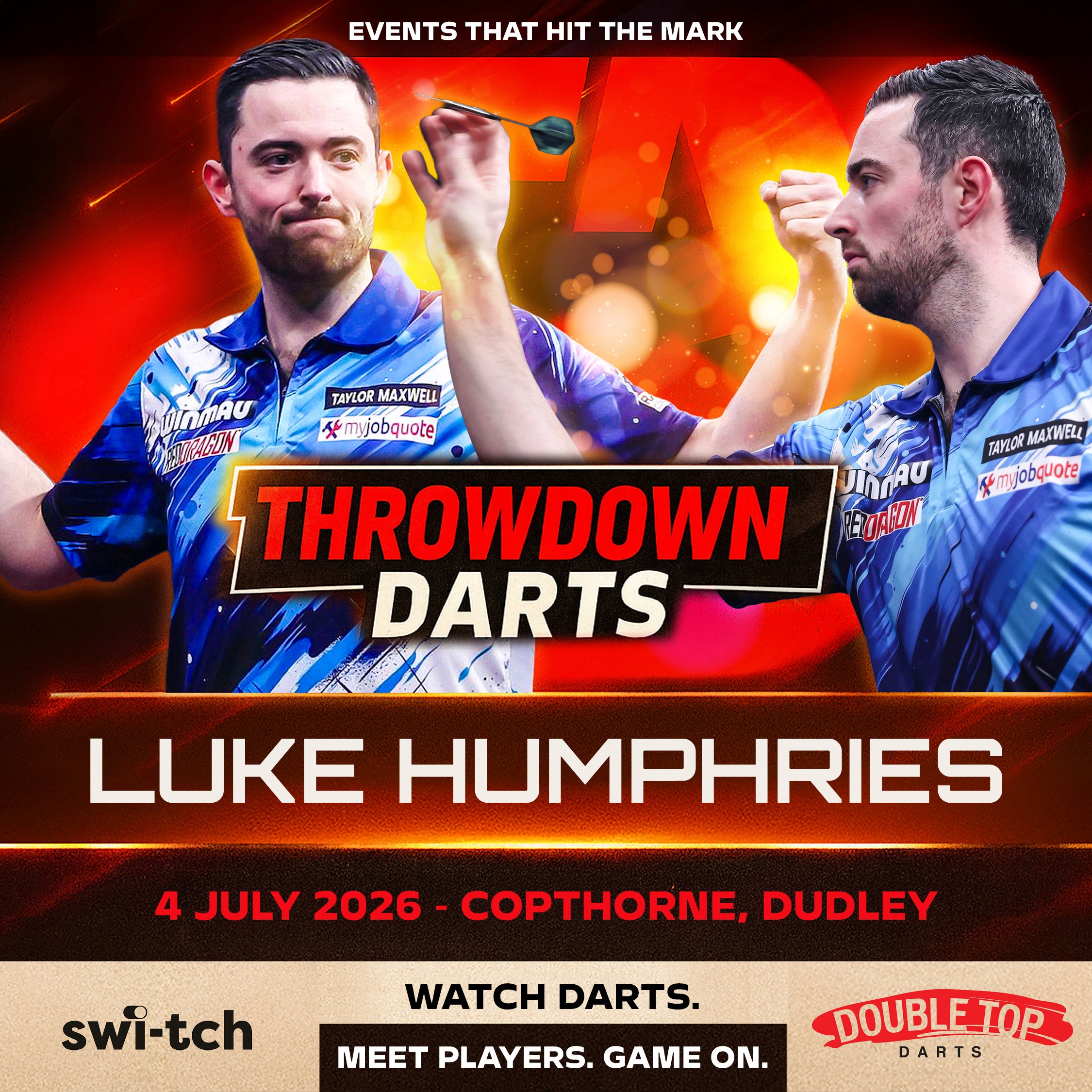 Throwdown Presents: Luke Humphries — Live Darts Night! VIP ENTRY 6PM | STANDARD ENTRY 7PM VIP ticket holders receive early entry, priority seating, and the opportunity to meet the player, have a professional photo taken, and receive a signed framed photo from Luke Humphries. Get ready for a huge night of darts entertainment as Throwdown brings you one of the sport’s biggest stars… Throwdown Presents: Luke Humphries lands at the Copthorne Hotel on Friday 4th July for an unforgettable evening packed with action, atmosphere, and top-class darts. Expect a full night of entertainment featuring: ✅Your favourite darts influencers taking on Luke ✅ Meet & greet opportunities ✅ Photos & autographs ✅ Games, challenges & crowd interaction ✅ An evening made by the fans for the fans Whether you're a serious darts fan or just looking for a brilliant night out with friends, this is the event for you. Limited tickets available — don’t miss out! 📍Event Details Date: Friday 4th July Venue: Copthorne Hotel Event: Throwdown Presents Luke Humphries Tickets: Limited availability – early booking recommended Important Info Tickets are sold on a first come, first served basis Seating/entry rules may apply depending on ticket type This event is expected to sell out — book early to avoid missing out Pricing: Standard Free (just pay booking fee) Standard Adult (£30) Standard U14s (£20) VIP Meet & Greet (Adult £65, Under 14s £45) Signed & Framed photo with Player. Platinum VIP; (£275)- Guaranteed Leg against player on stage + signed and framed photo with player.